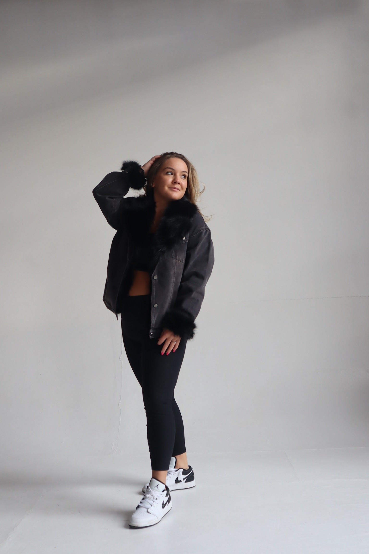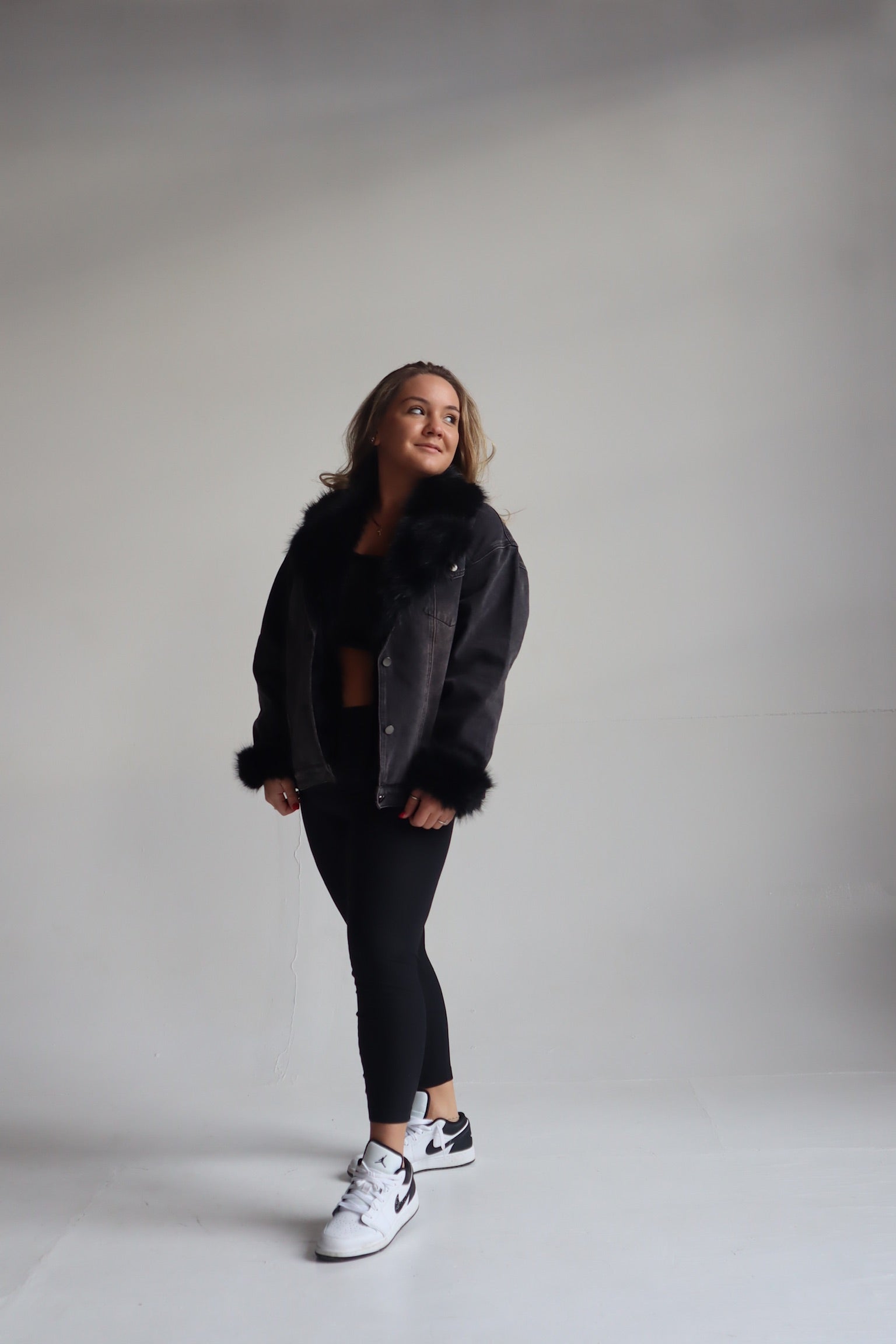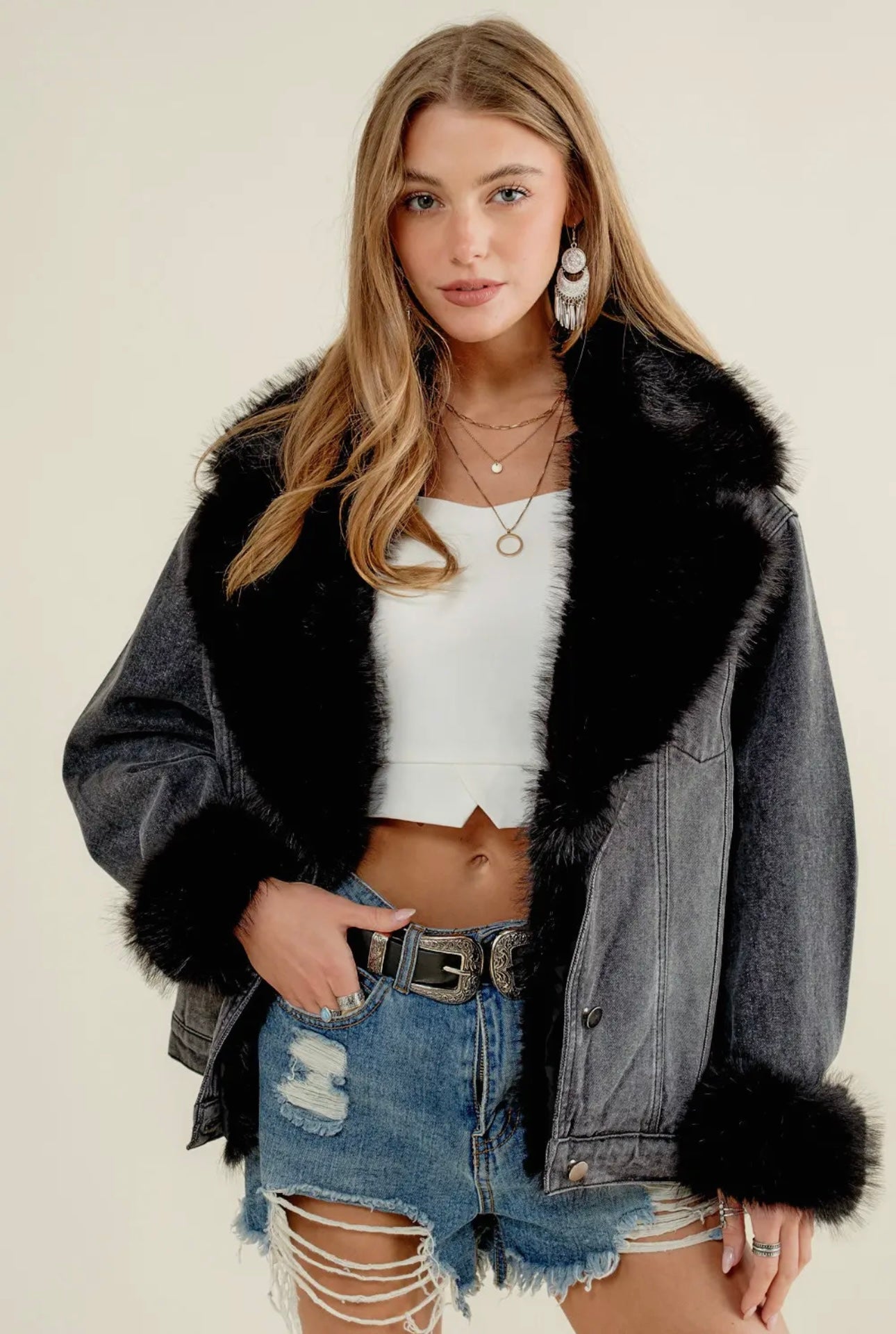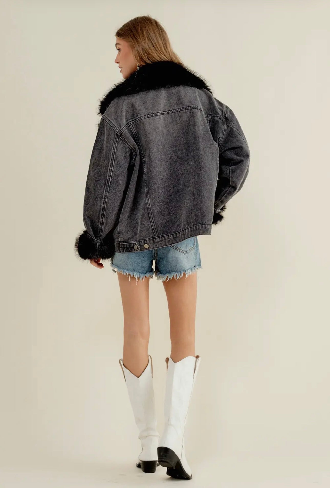 Fur collared cuff over sized washed denim jacket